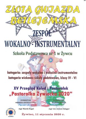 Z radością informujemy, że zespół wokalno - instrumentalny naszej szkoły zajął w swej kategorii I miejsce w XV Przeglądzie Kolęd i Pastorałek „Pastorałka Żywiecka 2020” i w sobotę, 11 stycznia 2020 r., wystąpił w konkursie finałowym w MCK w Żywcu.