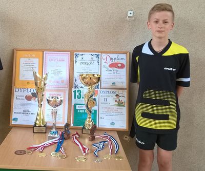 Przedstawiamy Filipa Rułkę, aktualnego Mistrza Śląska Młodzików w Tenisie Stołowym w Grach Podwójnych. Jest on również członkiem drużyny, która w tychże mistrzostwach zajęła I miejsce. Filip zaczął grać w tenisa, do czego zachęciła go mama, gdy skończył siedem lat. Po roku już aktywnie trenował i wziął udział w pierwszych zawodach. Obecnie swoje umiejętności doskonali pod okiem trenera Jerzego Schreibera, podpatrując starszych doświadczonych zawodników oraz oglądając mecze rangi międzynarodowej. W przyszłości chciałby zostać indywidualnym mistrzem Śląska w tenisie stołowym, czego serdecznie mu życzymy. O licznych sukcesach Filipa w tym i w poprzednim roku szkolnym czytaj w zakładce Osiągnięcia.