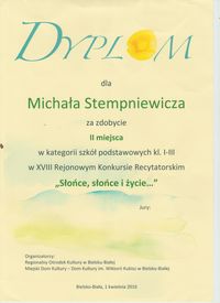 Z dumą prezentujemy sylwetkę Michała Stempniewicza, wszechstronnie uzdolnionego ucznia klasy III b, który w tym roku szkolnym dopisał do obszernej listy swoich sukcesów zajęcie II miejsca w XVIII Rejonowym Konkursie Recytatorskim w kategorii klas I-III. Ten utalentowany recytator i matematyk to również świetny piłkarz, powoływany często do kadry Śląska.